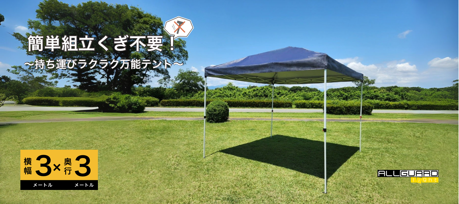 ガレージテント専門ブランドALLGUARD light 3×3m。簡単組立でくぎ不要、持ち運びラクラク。屋外イベントやバーベキューの日よけ・雨よけ、災害時の臨時テントとしても活躍します。