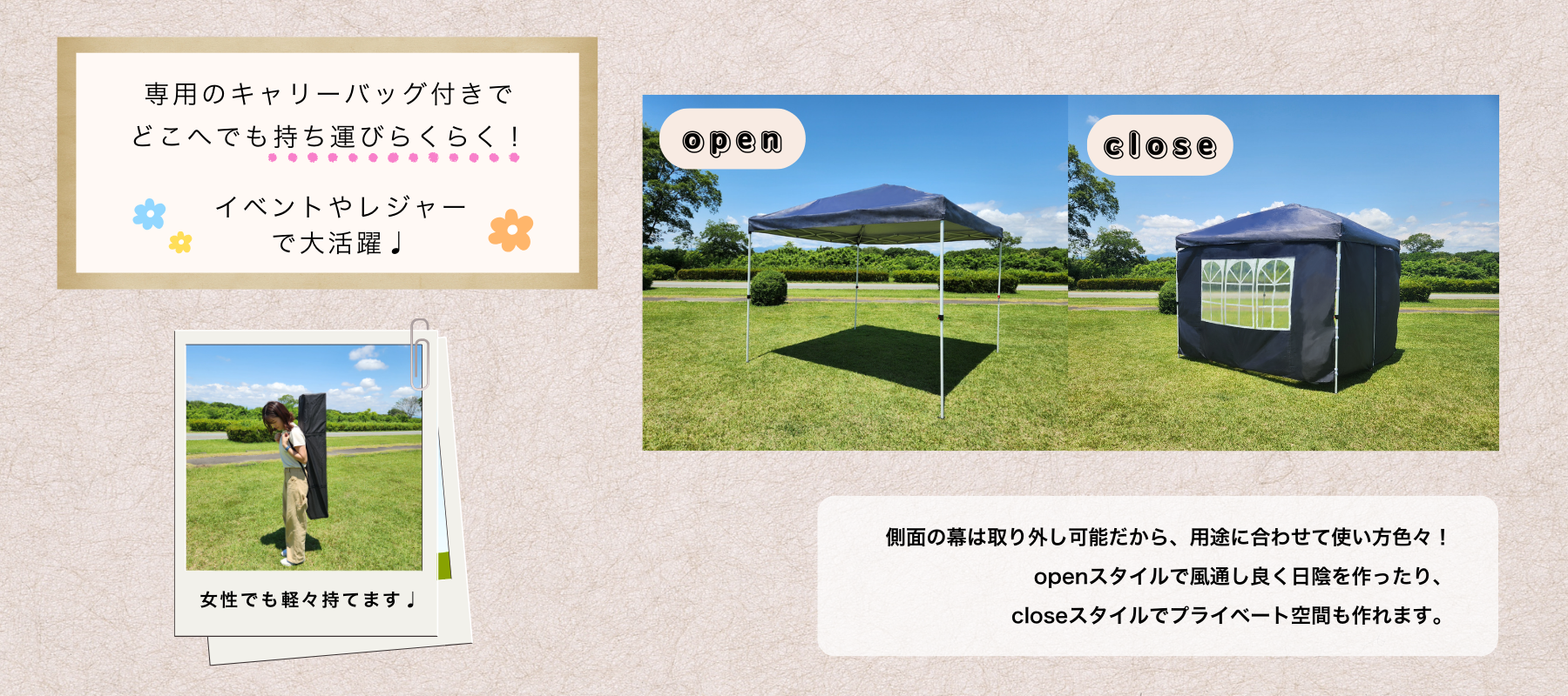専用キャリーバッグ付きで持ち運び便利な3×3mテント。窓付き幕や入口付き幕を別売りで用意し、用途に応じて組み合わせできるため、イベントやレジャーに幅広く活用できます。