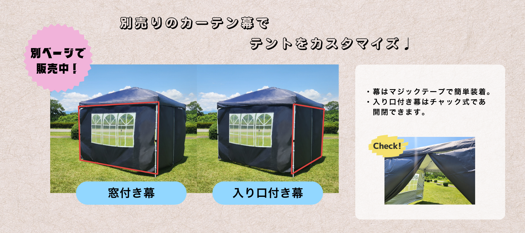 3×3mテント用の別売りカーテン幕。窓付き幕は採光に便利、入口付き幕はチャック式で開閉可能。マジックテープで簡単に装着でき、用途に合わせてテントを自由にカスタマイズできます。