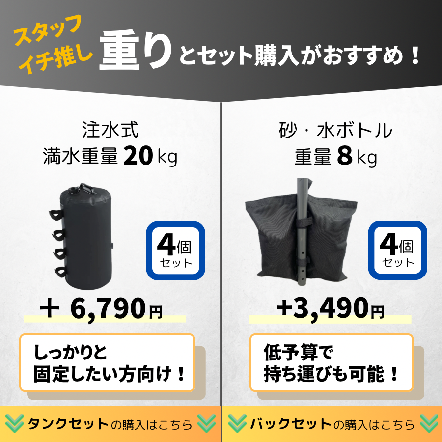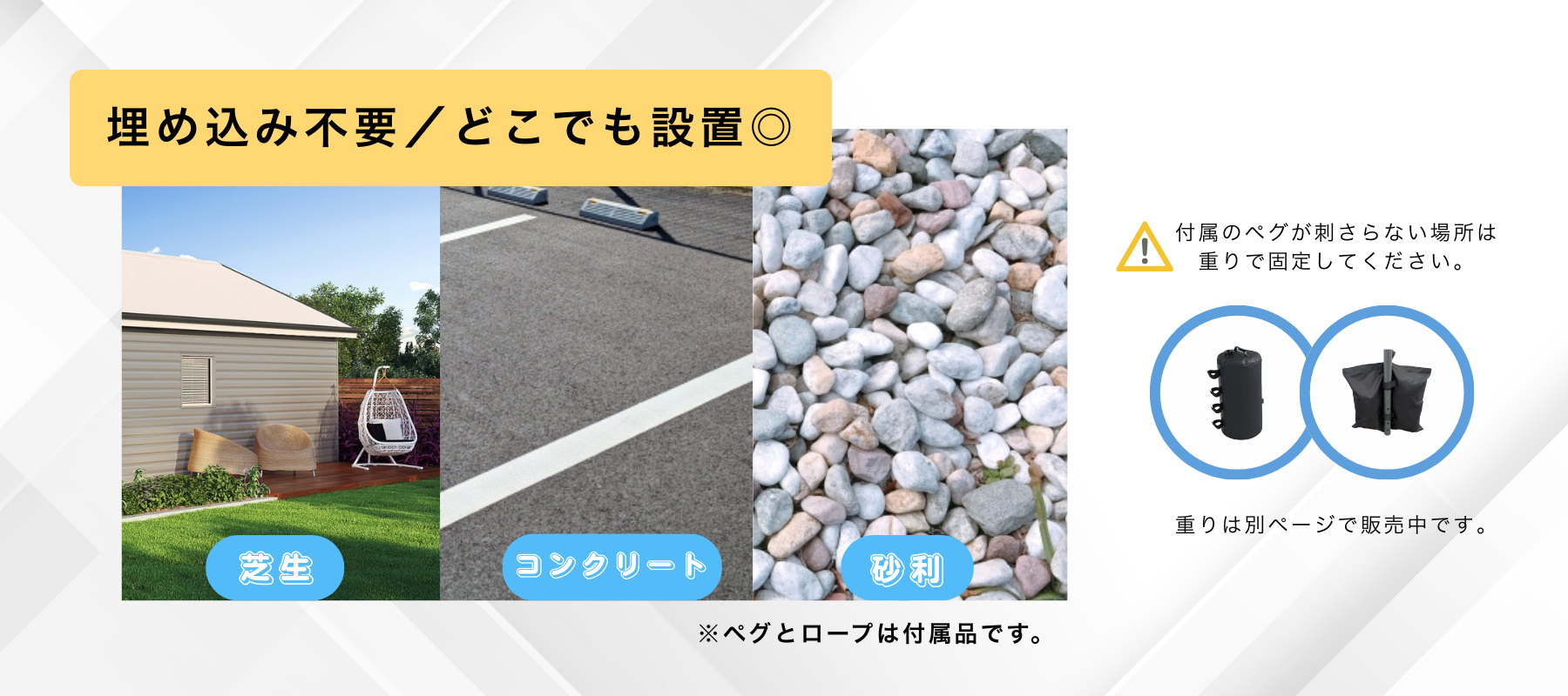 埋め込み不要でどこでも設置できる3×3mテント。芝生やコンクリート、砂利など様々な地面に対応。ペグが使えない場所は重りで固定可能で、イベントやレジャーなど幅広く活用できます。