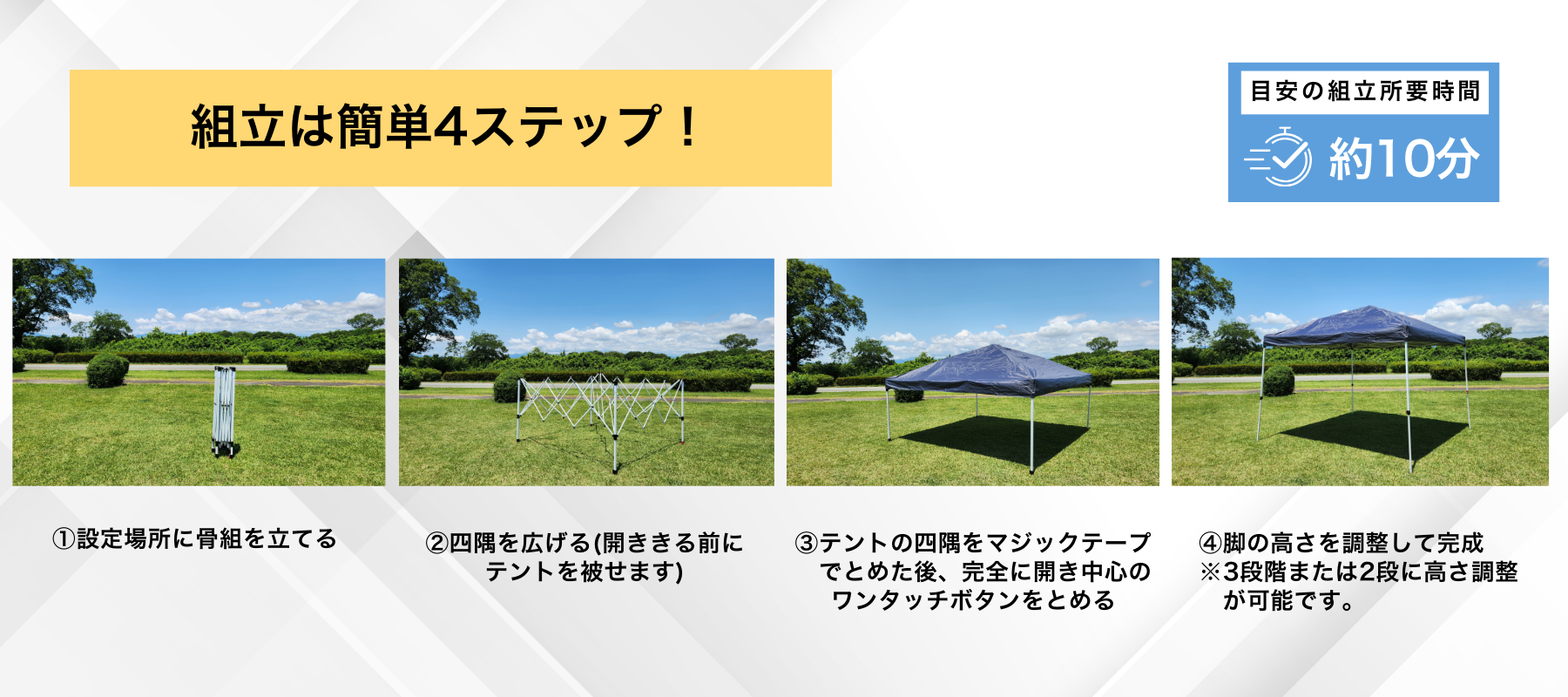 3×3mワンタッチテントの組立は簡単4ステップ。骨組を立てて四隅を広げ、マジックテープとワンタッチボタンで固定。脚の高さは2~3段階で調整可能で、初心者でもスムーズに設置できます。