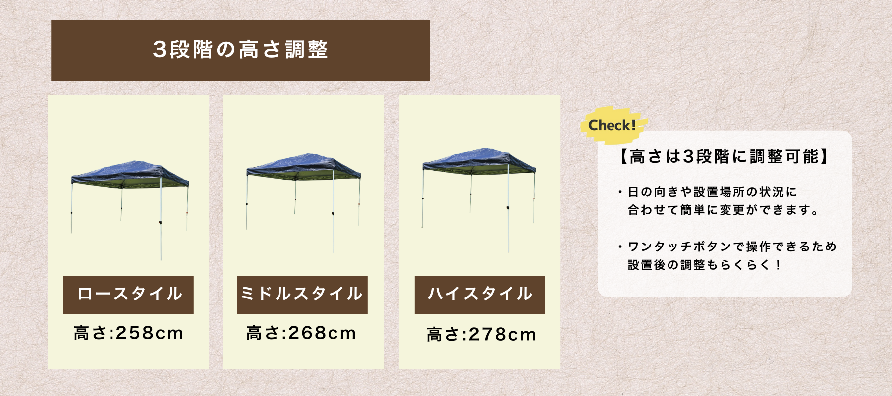 3×3mテントは高さを3段階に調整可能。ロー258cm・ミドル268cm・ハイ278cmに切り替えでき、日差しの向きや設置場所に合わせて柔軟に対応。ワンタッチボタンで簡単に変更できます。