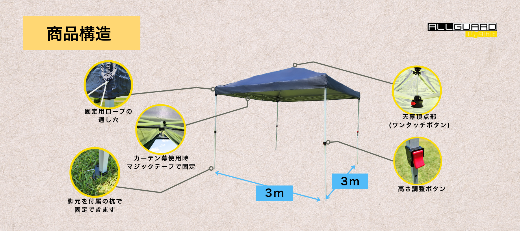 ワンタッチタープテントの商品構造図。天幕頂点部にワンタッチボタン、高さ調整ボタン付き。固定用ロープの通し穴やマジックテープ式カーテン固定、脚元の杭固定構造を採用。耐風性と安定性に優れ、屋外イベントや作業用にも最適な3×3mテント。